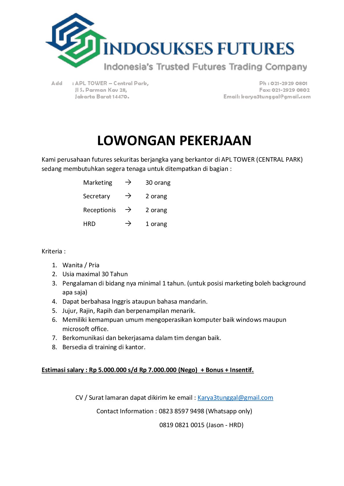 Pt Indosukses Futures Membuka Lowongan Sales And Marketing Specialist Di Area Dki Jakarta Linkedin